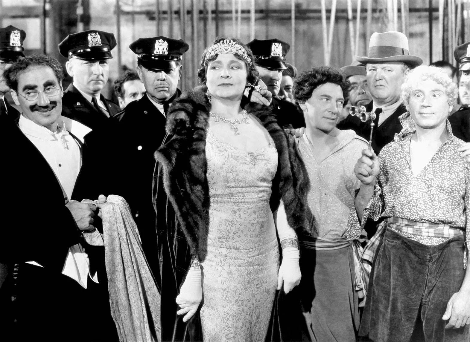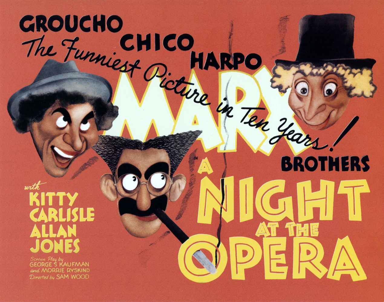 האחים מארקס עושים הכל כדי להרוס הצגת אופרה על מנת לעזור לזוג נאהבים. הסרט לועג למיטב הקלישאות של העלילה ההוליוודית הרומנטית. סרט זה הוא אחד משיאי היצירה שלהם וכולל כמה מהסצנות היותר מפורסמות והמטורפות, כולל ההידחסות של המון אנשים לתא קטן באוניה. גראוצ'ו מפגיז בשנינויות, הארפו תורם את קטעי הנגינה על הנבל והפנטומימה וצ'יקו מפליא כתמיד בנגינה וירטואוזית על הפסנתר – סימן ההיכר המפורסם שלו.